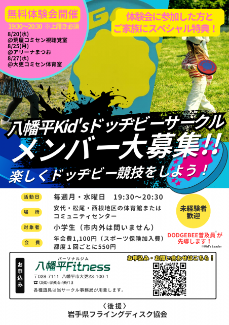 八幡平市で楽しくドッヂビーをするサークルです。 DODGEBEE普及員(Kid's Leader)が先導します。 ※小学生対象